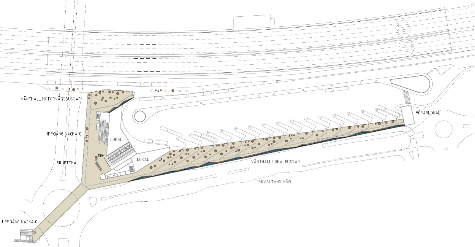 Anläggningen har entré från Nacka Forum, Stadshuset och Nacka Strand. Förarlokal är placerad längst in i vänthall för lokalbussarna med överblick över det stora rummet. På så sätt görs denna del av anläggningen både livligare och tryggare för resenärerna.